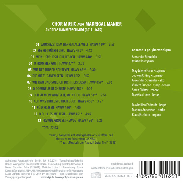 This album represents the first recording of selected works from the Chor-Music, which contains 31 pieces, in combination with duets and terzets from Hammerschmidt’s first work, Musicalische Andacht Erster Theil (1638). Taken together, these display the formal versatility of the master and clarify his approach, which is oriented to the creative implementation of genre models.